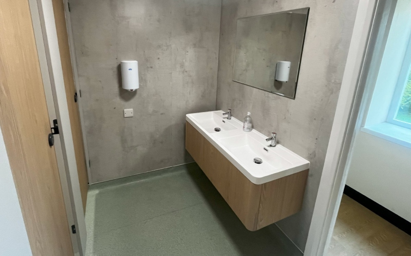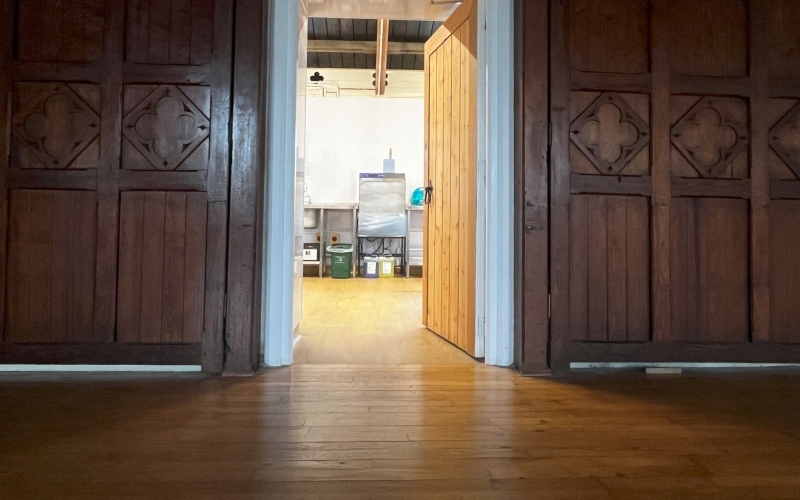 Mae drws newydd yng nghefn y neuadd ar gyfer ramp anabl a dihangfa tân cadair olwyn hefyd wedi'i ychwanegu.